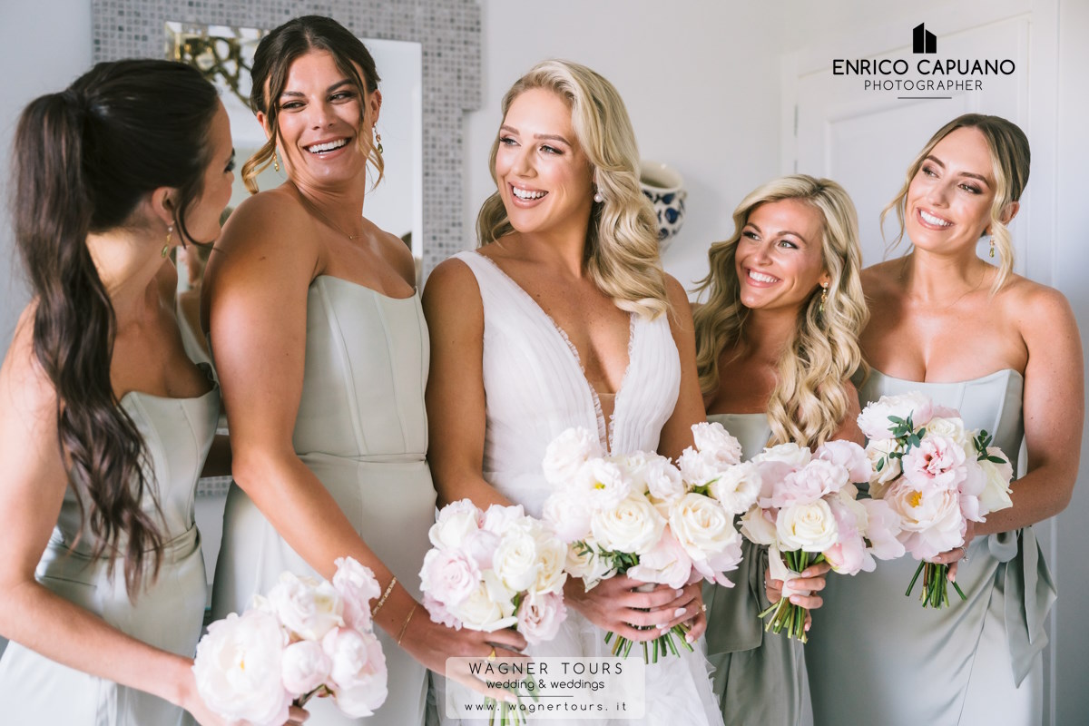 Leigh and Her Bridesmaids Showcasing Their Bouquets - In this vibrant photo, Leigh stands surrounded by her bridesmaids, each holding a beautifully arranged bouquet. The group radiates joy and elegance, with each bouquet adding a splash of color that perfectly complements the romantic setting of Villa Eva in Ravello. The lush green gardens and Amalfi Coast backdrop highlight the fresh, floral arrangements, capturing a moment of friendship, beauty, and celebration on Leigh and Joshua’s special day.