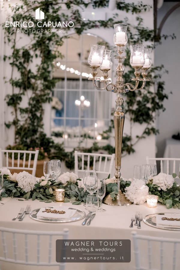 Immerse yourself in the enchantment of a special open-air dinner setting organized by wedding planners Mario Capuano and Annamaria Staiano at Villa Eva. The atmosphere is adorned with imperial-style chandeliers casting a soft glow, complemented by tall vases filled with exquisite flowers in various shades of white. The combination of these elegant elements creates a magical ambiance, transforming your dining experience into a truly unforgettable affair